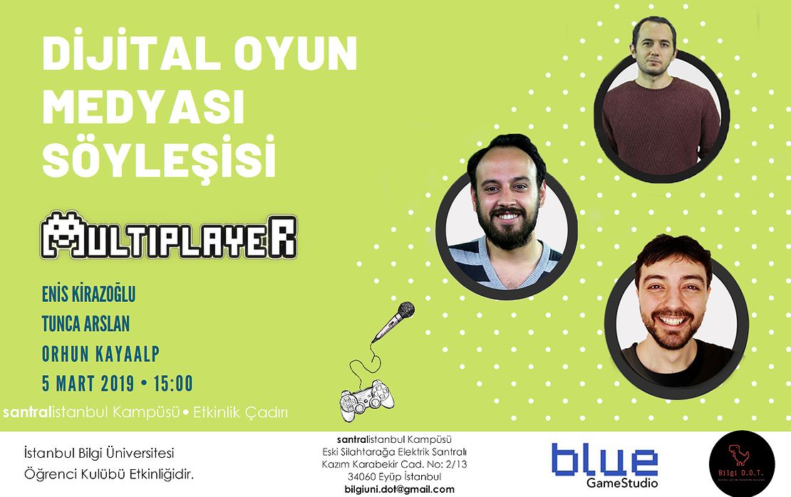 Enis Kirazoğlu, Tunca Arslan ve Orhun Kayaalp'ten oluşan Multiplayer ekibi 5 Mart günü saat 15:00'te santralistanbul Kampüsü Etkinlik Çadırında Dijital Oyun Tasarımı üzerine bir söyleşi gerçekleştireceklerdir. Etkinliğe katılmak için aşağıdaki formu doldurmanız gereklidir.